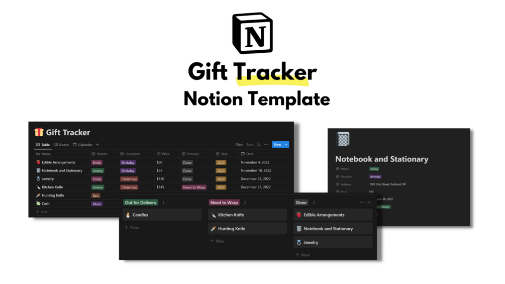 This Notion template will help you organize gifts you purchase for birthdays, holidays, and special occasions.