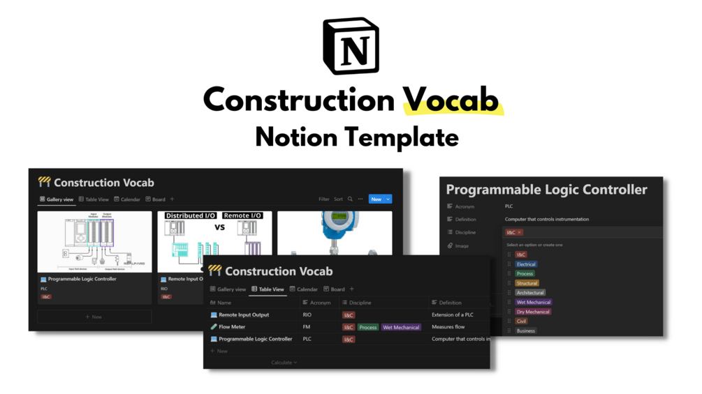 This Notion template will help you organize acronyms, vocabulary words, and design symbols in the construction industry.